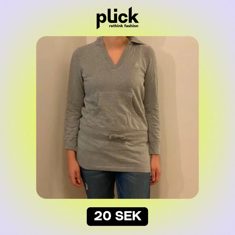 Säljer en grå hoodie med v-ringning och huva. Den har en praktisk ficka framtill och en dragsko i midjan för justerbar passform. Perfekt för en avslappnad stil och passar bra till jeans. Skön och enkel att bära till vardags.