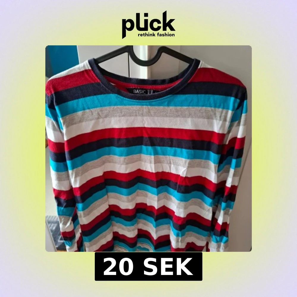 Säljer en långärmad tröja från BASIC U med färgglada horisontella ränder i rött, blått, vitt, grått och mörkblått. Tröjan har en klassisk rund halsringning och är perfekt för dig som gillar en färgstark stil.