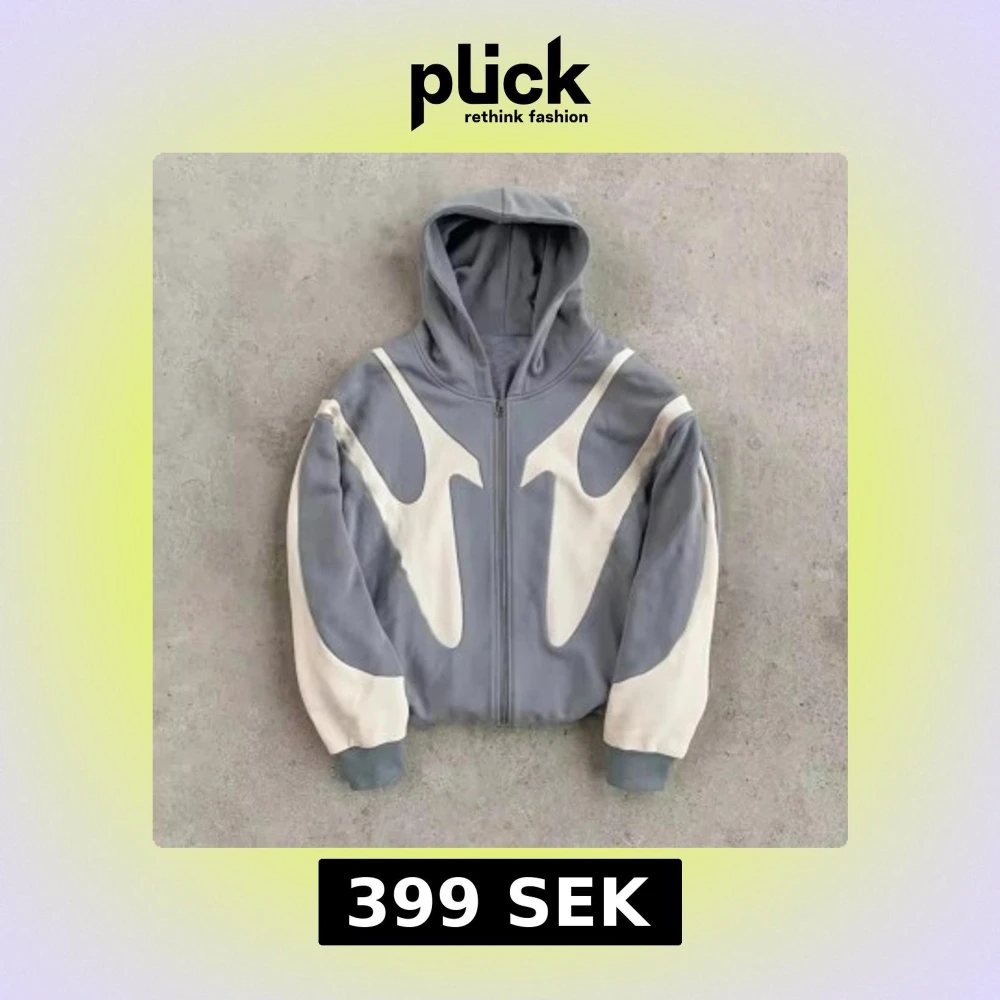 Säljer en unik hoodie i grått och vitt med coolt grafiskt mönster. Tröjan har dragkedja framtill, huva och ribbade muddar. Perfekt för dig som vill sticka ut med en modern streetstyle-look.
