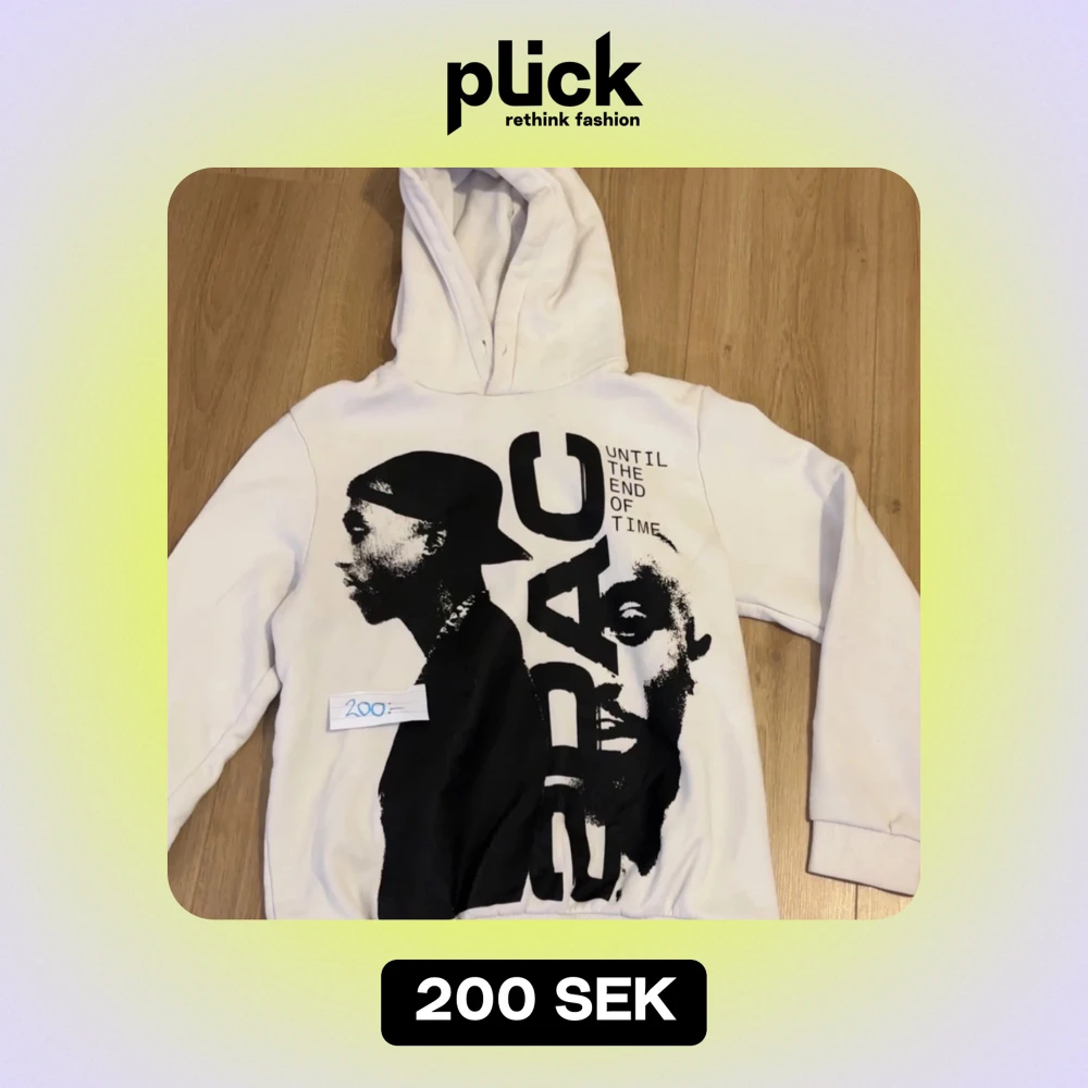 Säljer en vit hoodie med stort 2Pac-tryck på framsidan och låtlista på baksidan. Perfekt för alla hiphop-fans! Den är i bra skick och har en skön passform. Huvan är mysig och perfekt för kyliga dagar. Passar både till vardags och chillkvällar.