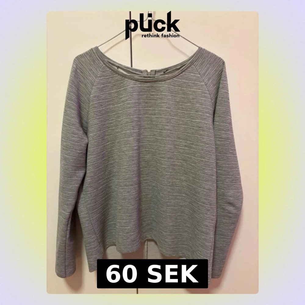 En stilren grå tröja med diskret strukturmönster och rundad halsringning. Tröjan har längre bakstycke och långa ärmar. Perfekt till jeans eller kjol för en enkel men snygg look. Storlekslapp bortklippt, passar en S-M