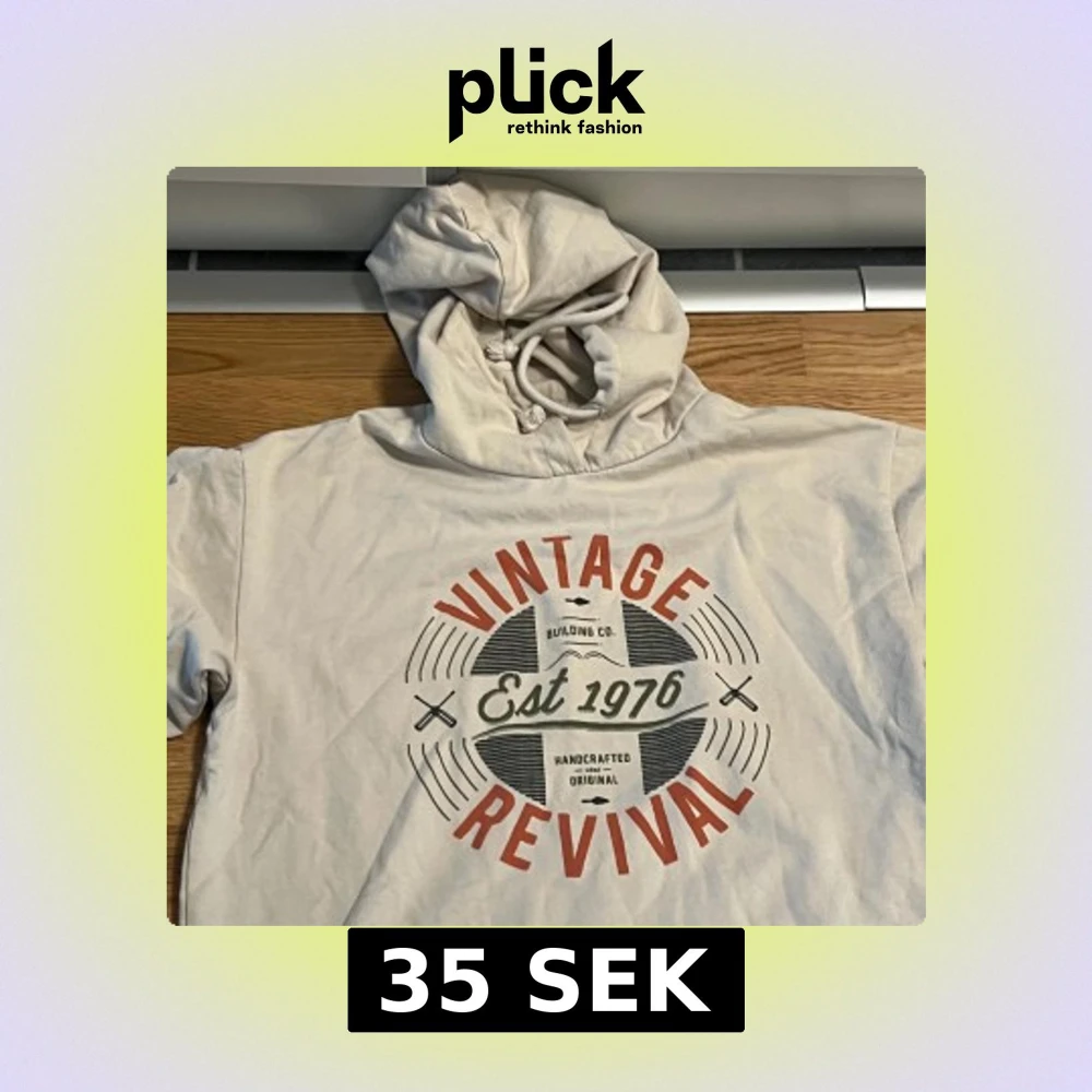 Säljer en vit hoodie från ADPT med trycket 'Vintage Revival' i rött och svart på framsidan. Hoodien har en klassisk design med dragsko i huvan och är perfekt för en avslappnad stil. Passar bra till jeans eller joggers.
