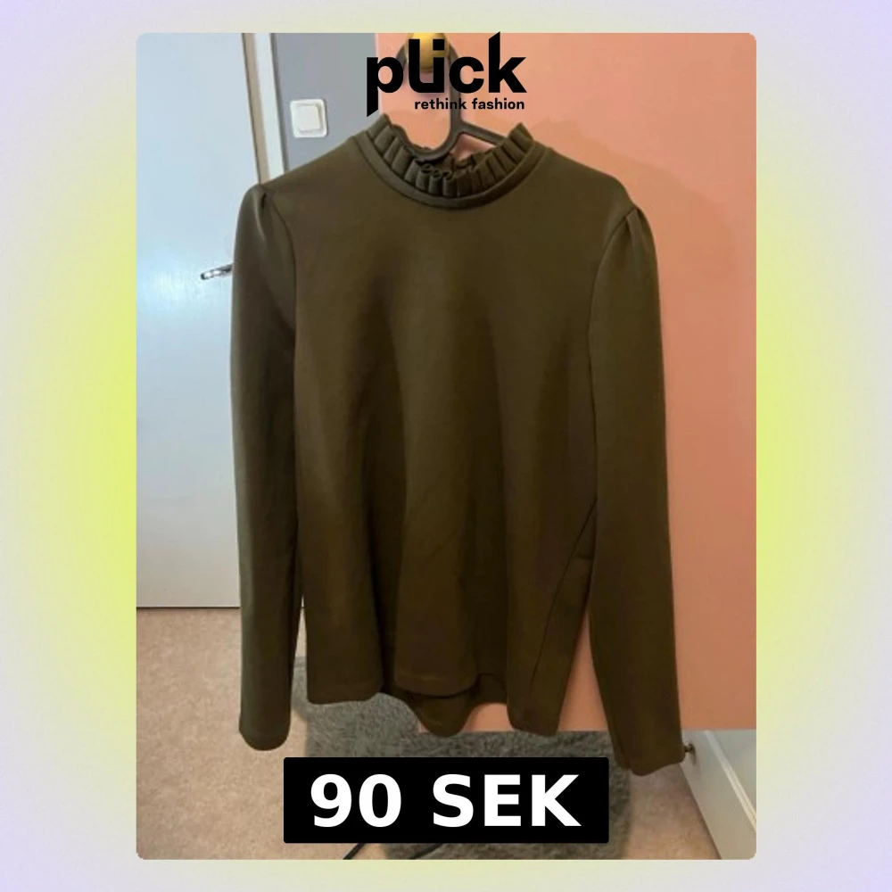 Säljer en mörkgrön långärmad topp med volangdetalj i halsen. Tröjan har en rak passform och puffade axlar som ger en snygg siluett. Perfekt för dig som vill ha något stilrent men ändå med en twist.