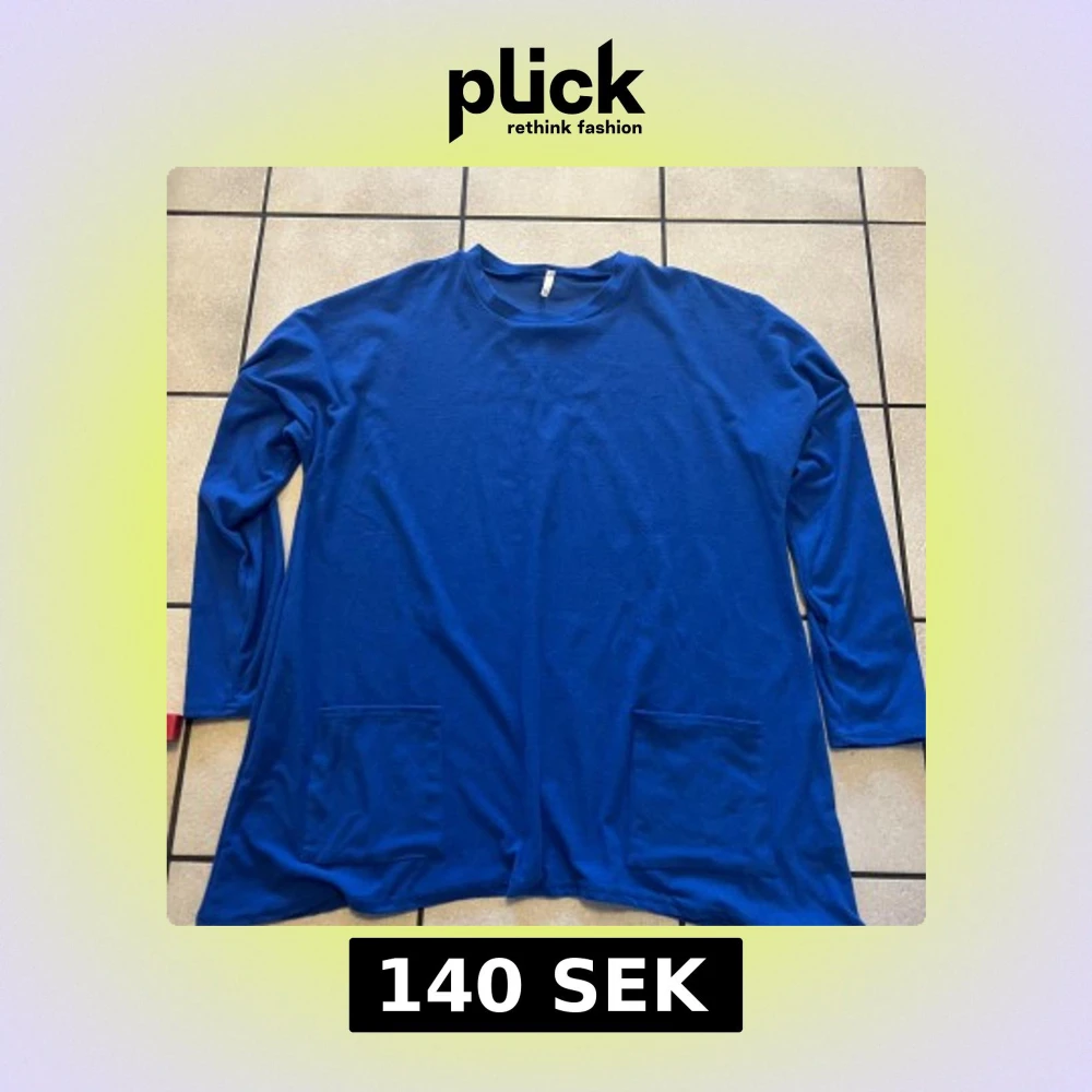 Säljer en blå långärmad tröja med rund hals och två praktiska fickor framtill. Perfekt för en avslappnad stil. Tröjan har en lös passform och är gjord i ett mjukt material.