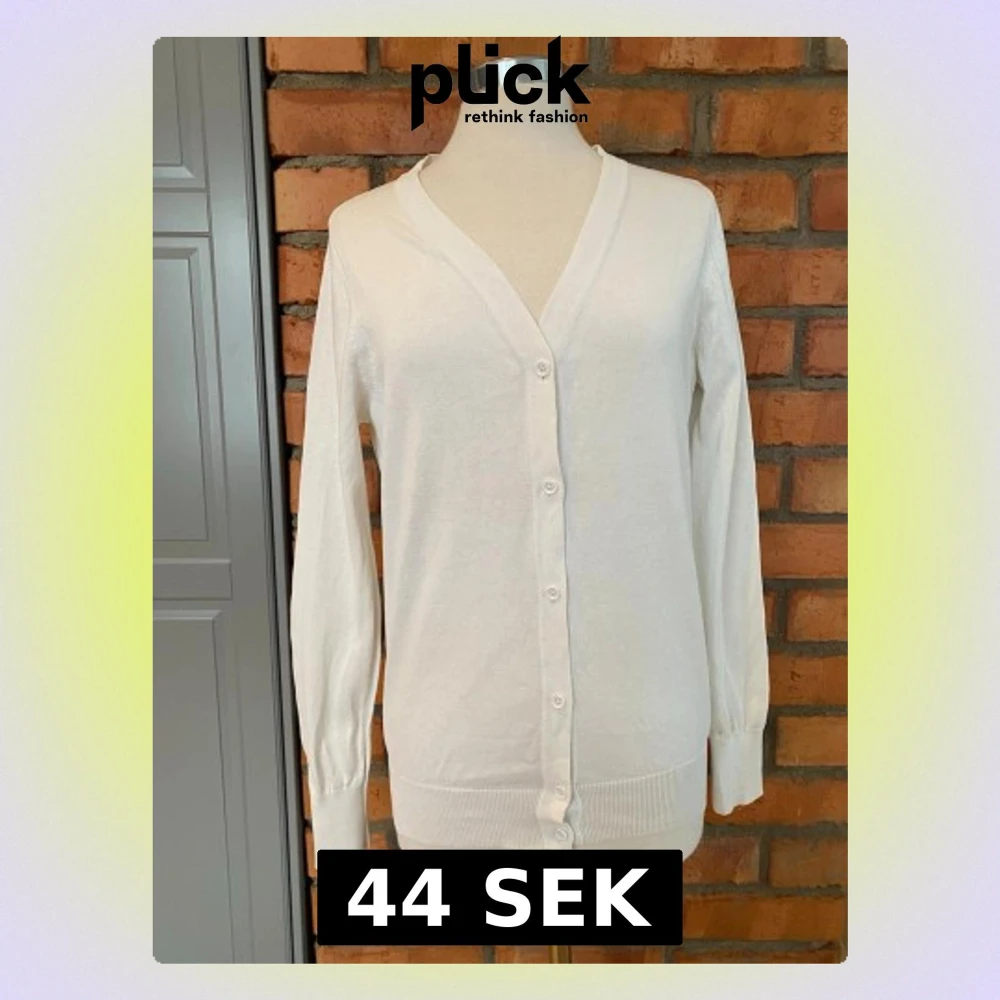 Klassisk vit kofta med v-ringning och långa ärmar. Koftan har ribbade muddar och knäpps med fem vita knappar framtill. Enkel och stilren design som passar till det mesta. Tillverkad i mjukt och tunt material.