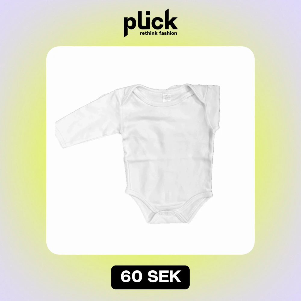 Vit babybody med långa ärmar. Den är gjord av bomull och har en praktisk knäppning i grenen för enkel på- och avklädning. Inga fläckar.