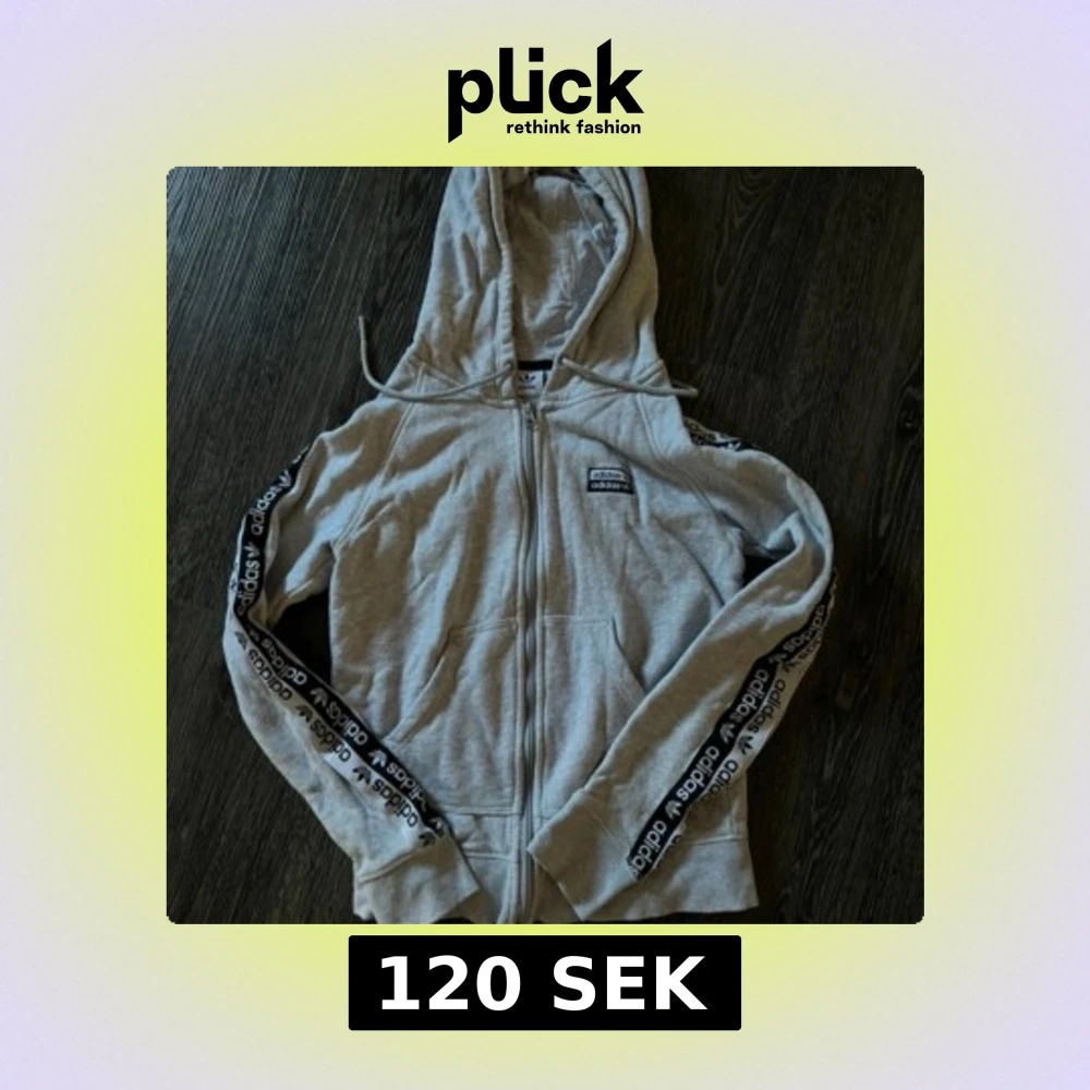 Säljer en grå hoodie från Adidas med dragkedja och huva. Tröjan har långa ärmar med Adidas-logga längs sidorna. Perfekt för en avslappnad stil.