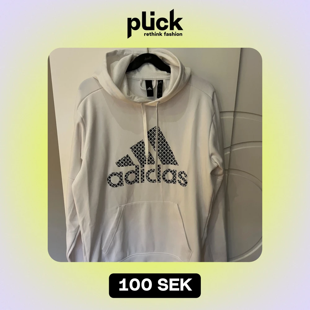 Säljer en snygg vit hoodie från Adidas i storlek M. Den har en stor logga på framsidan och en klassisk känguruficka. Perfekt för både vardag och träning. Huvan har dragsko för justerbar passform. Superbekväm och stilren! Knappt använd.