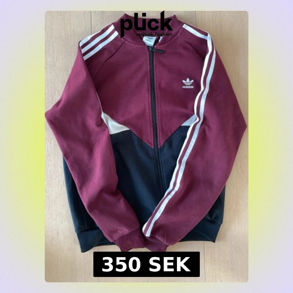 Snygg ziptröja från Adidas i vinrött och svart med vita ränder på ärmarna och logga på bröstet. Tröjan har hög krage, dragkedja och klassisk sportig design. Perfekt för en avslappnad streetstil.