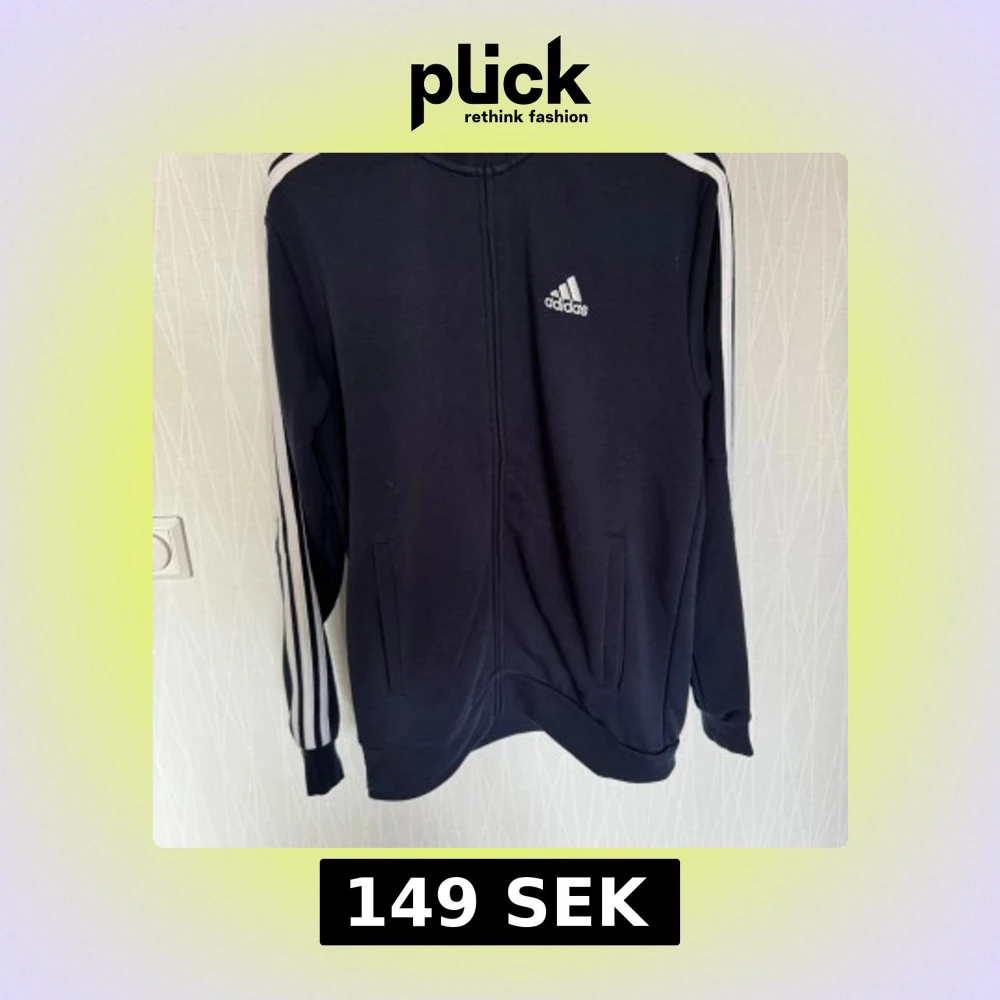 Säljer en svart hoodie från Adidas med vita ränder längs ärmarna och en dragkedja framtill. Tröjan har långa ärmar och en hög krage. Perfekt för träning eller vardagsbruk.