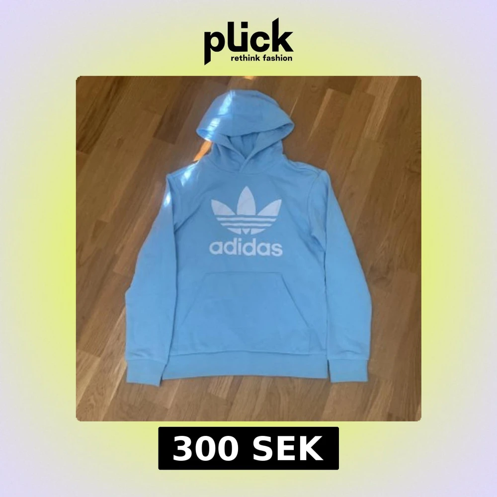 Säljer en ljusblå hoodie från Adidas med stor vit Trefoil-logga på bröstet. Tröjan har huva, magficka och ribbade muddar vid ärmslut och nederkant. Perfekt för chill dagar och streetstyle. Materialet är mjuk bomull som känns skönt mot huden.