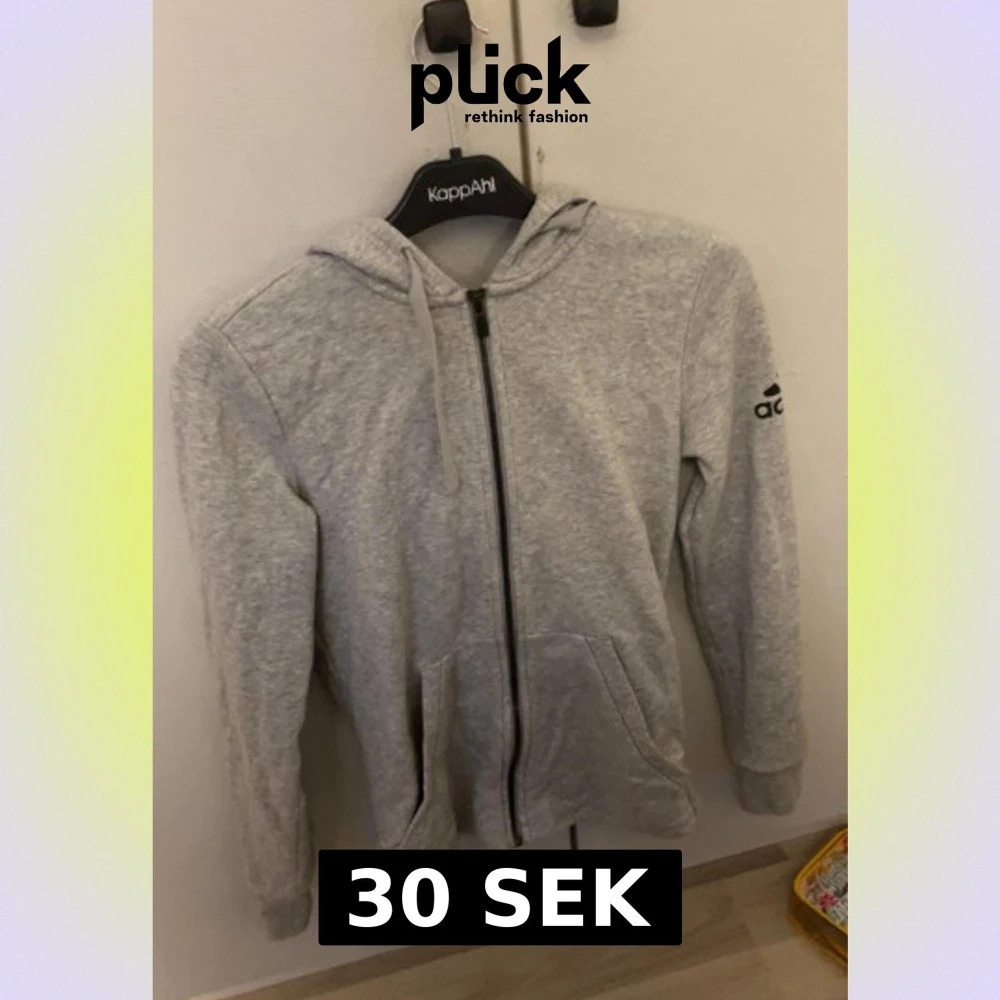 Säljer en grå hoodie från Adidas med svart dragkedja och snörning i huvan. Tröjan har långa ärmar, två fickor framtill och Adidas-logga på vänster ärm. Perfekt för chill eller träning, mjukt material och klassisk look.
