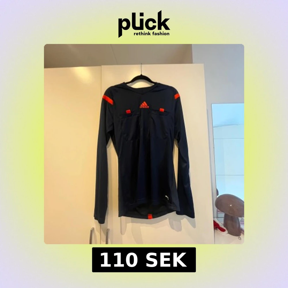 Säljer en mörkblå långärmad träningströja från Adidas med röda detaljer och logga på bröstet. Tröjan har en smal passform och är tillverkad i ett syntetmaterial som andas. Perfekt för löpning eller annan träning.