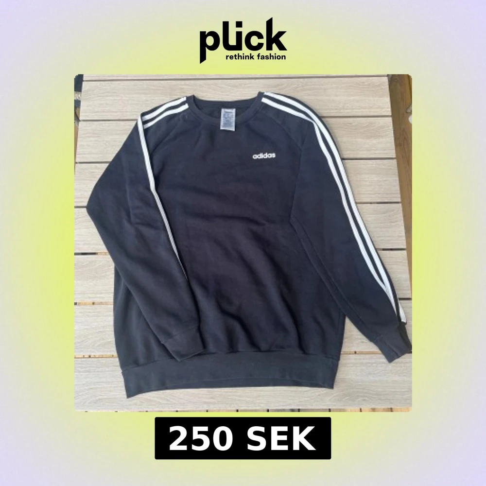 Svart sweatshirt från Adidas med klassiska vita ränder längs ärmarna och Adidas-logga på bröstet.