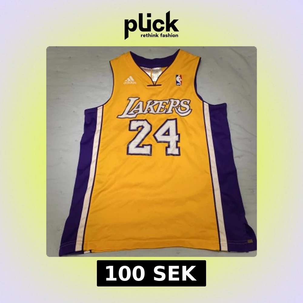 Säljer en gul Lakers basketlinne från Adidas med nummer 24 och texten 'Bryant' på ryggen. Linnet har lila detaljer på sidorna och ärmlös design. Perfekt för basketfans! 🏀