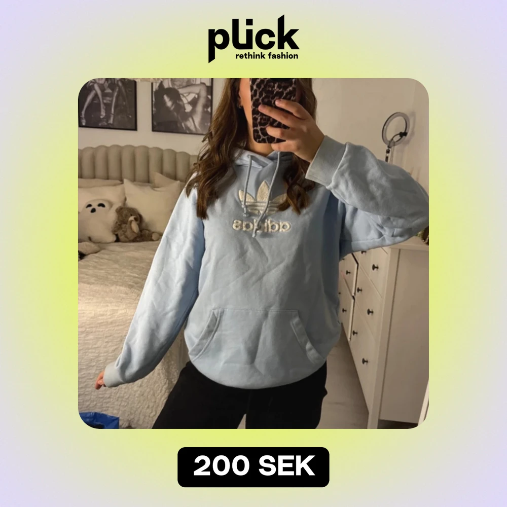 Mysig ljusblå hoodie från Adidas med den klassiska loggan i vitt framtill. Finns en sminkfläck inuti hoodie som jag tror går bort med vanish men inget som syns när man har på den