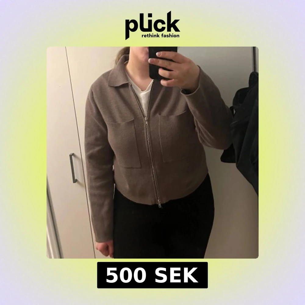 Säljer en stilren brun/beige kofta med dragkedja framtill och två stora fickor. Jackan har en klassisk krage och långa ärmar, perfekt för höst och vår. Passar till både vardag och mer uppklädda tillfällen. Den här är endast testad och knappt använd.