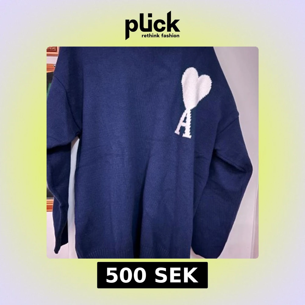 Säljer en mörkblå stickad tröja från Ami Alexandre Mattiussi med ett stort vitt hjärta och bokstaven A på bröstet. Tröjan har rund halsringning och långa ärmar, perfekt för dig som gillar stilrena och trendiga plagg. Den skulle passa bra ifall du har på dig M