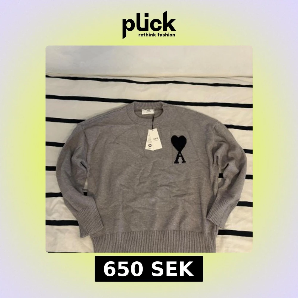 Snygg grå stickad tröja från Ami Alexandre Mattiussi med svart hjärta och A broderat på bröstet. Tröjan har rund hals, ribbade muddar och är långärmad. Perfekt för dig som gillar stilrena detaljer och vill ha något som sticker ut lite. Hör av dig om du har några frågor.