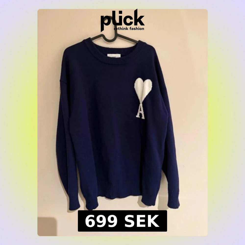 Mörkblå stickad tröja från Ami Paris med ikoniskt vitt hjärta och bokstaven A broderat på bröstet. Tröjan har rund halsringning, långa ärmar och ribbade muddar. Perfekt för dig som gillar stilrena detaljer och klassisk design.