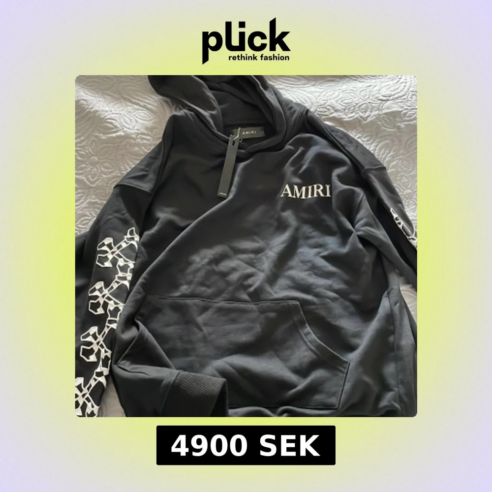 Svart hoodie från Amiri i 100% bomull med vit logga på bröstet och coolt grafiskt tryck längs ärmarna. Klassisk känguruficka framtill, ribbade muddar och huva. Snygg detalj med metallbricka med Amiri-logga. Perfekt för dig som gillar streetwear Den e även helt ny.