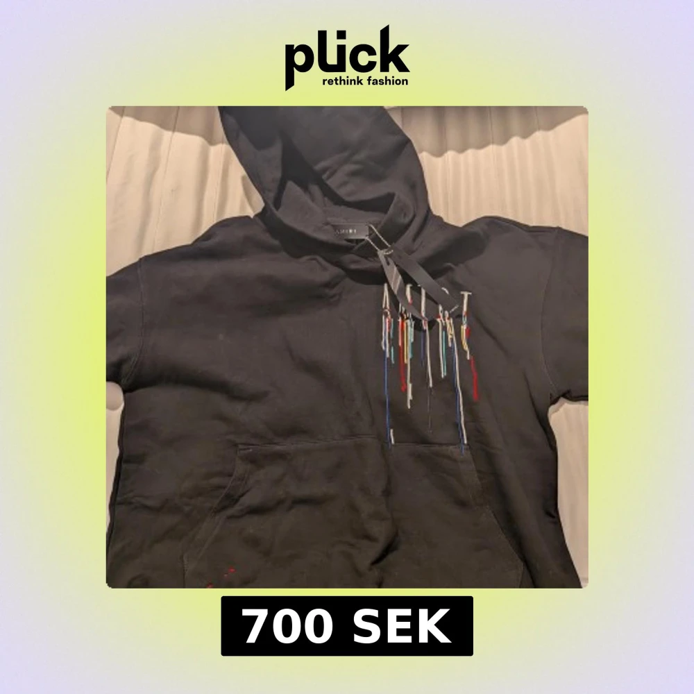 Svart hoodie från Amiri med färgglada broderade detaljer som rinner ner från loggan både fram och bak. Tröjan har huva, känguruficka och cool streetkänsla. Perfekt för dig som gillar unika och trendiga plagg.