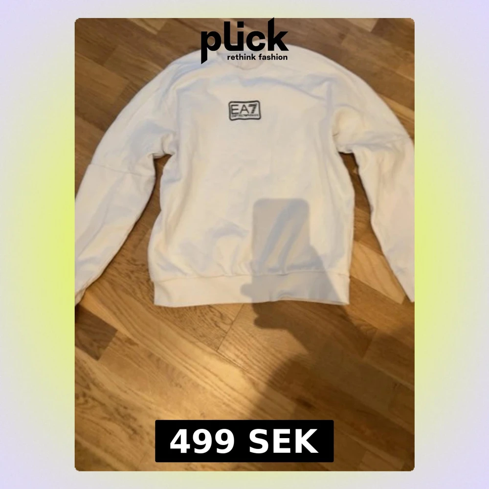 Säljer en vit sweatshirt från EA7 Emporio Armani med logotyp på bröstet. Tröjan har långärmad design, rund halsringning och ribbade muddar. Perfekt för dig som gillar stilrena och klassiska plagg.