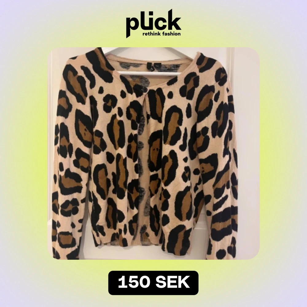 En beige kofta med leopardmönster i svart och brunt. Koftan har långa ärmar och ribbstickade muddar vid ärmslut och nederkant.