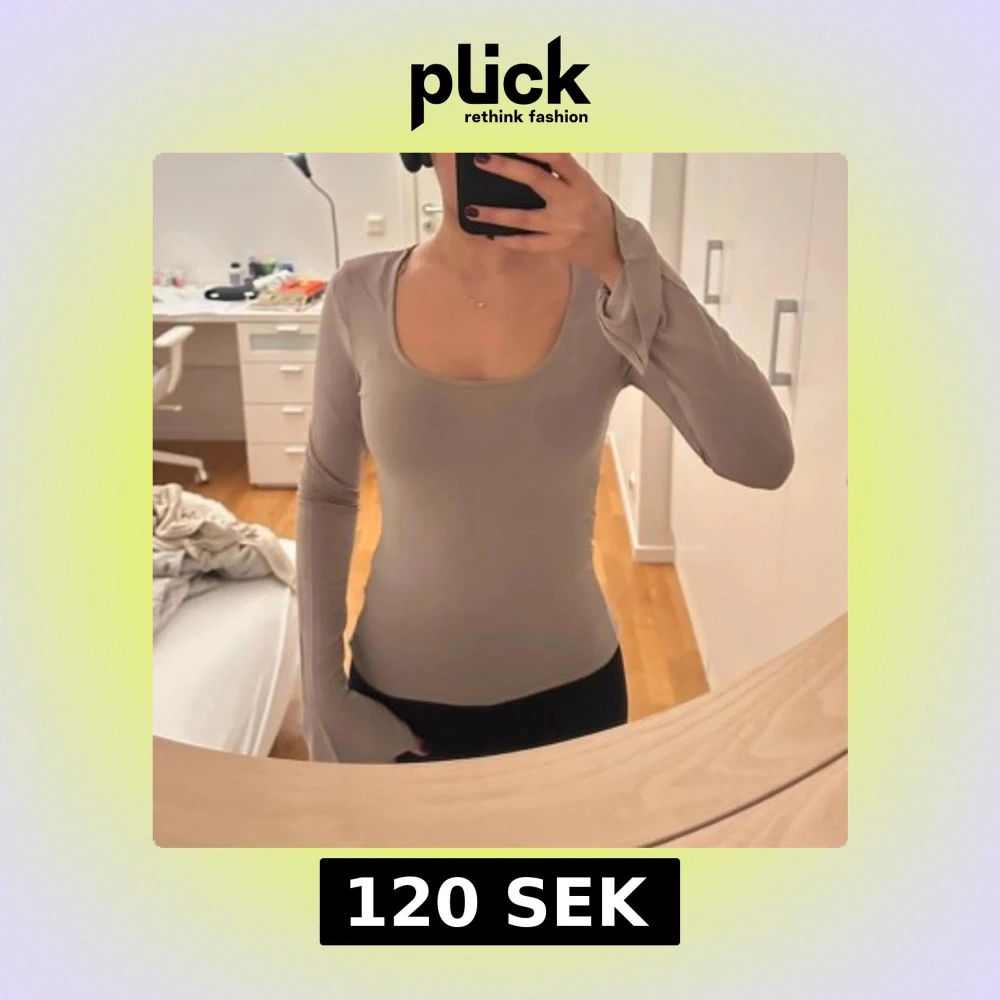 Säljer en stilren beige långärmad topp med en djup rund halsringning. Perfekt för lager-på-lager eller att bära som den är. Passar till både jeans och kjol för en avslappnad look.
