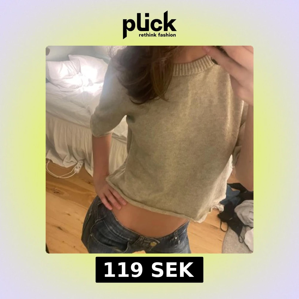 Säljer en beige croppad tröja från vila med korta ärmar och en ribbad halsringning. Perfekt för en avslappnad stil. Tröjan har en vågig kant nertill som ger en extra touch.💕