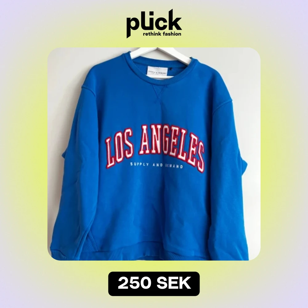 Säljer en snygg blå sweatshirt från Supply & Demand med texten 'Los Angeles' i rött och vitt på framsidan. Tröjan är i storlek S och har en oversized passform. Mycket bra skick förutom en defekt på tröjan (se bild)