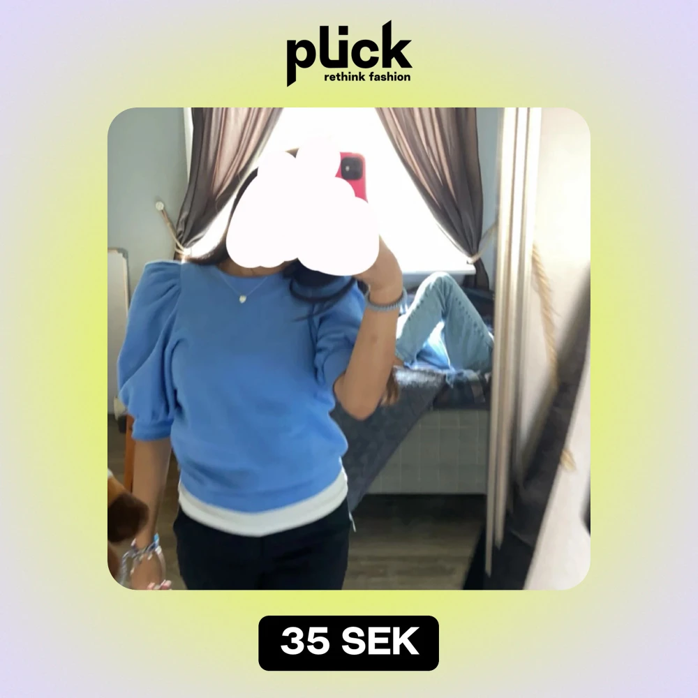 Säljer en snygg blå tröja med puffärmar och rund halsringning. Perfekt för en stilren look!