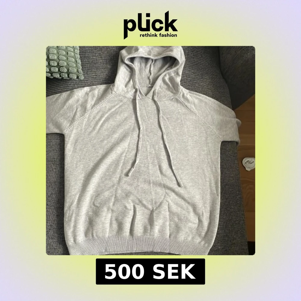 Säljer en stilren grå hoodie med korta ärmar och justerbar huva. Perfekt för en avslappnad look. Ribbstickad nederkant ger en snygg passform.