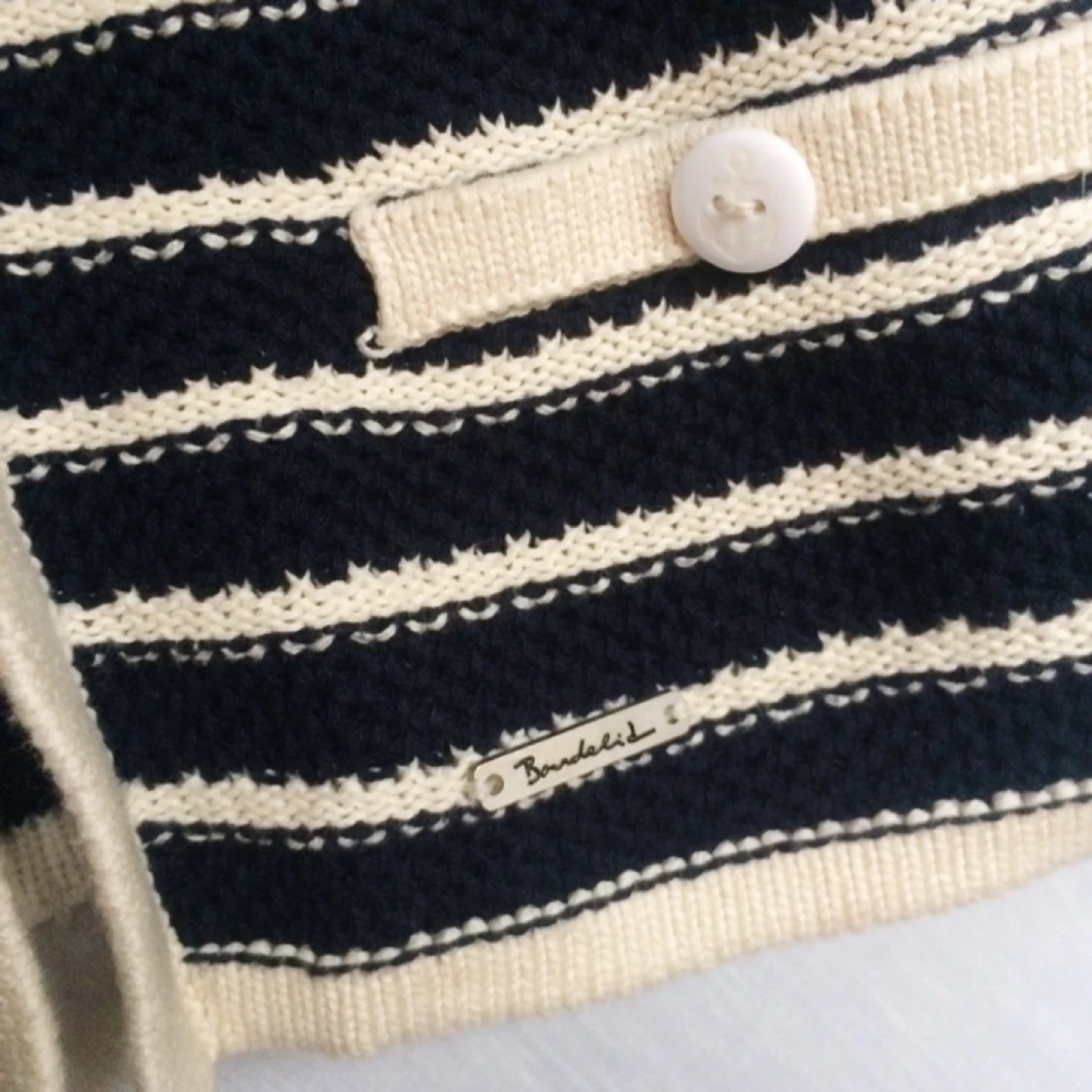 BONDELID - MARIN STIL En enkel men stilfull kofta som kan ge en simpel outfit det där lilla extra! Marinblå och krämvit, knäpps med en knapp. Plagget har inte använts särskilt många gånger och är i gott skick.