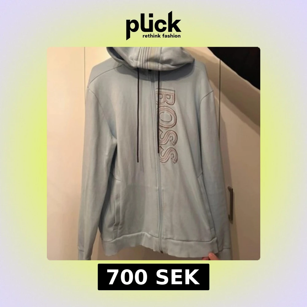 Säljer en stilren ljusblå hoodie från BOSS med dragkedja och justerbar huva. Tröjan har en broderad logotyp på bröstet och ribbade muddar vid ärmslut och nederkant. Perfekt för en avslappnad stil.