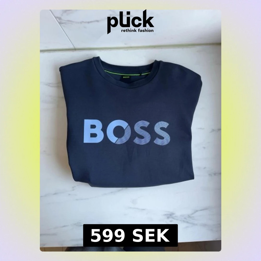 Snygg mörkblå sweatshirt från BOSS med stort tryck i ljusblått på bröstet. Helt perfekt skick, nästan som nytt, inga defekter alls, storlek L!