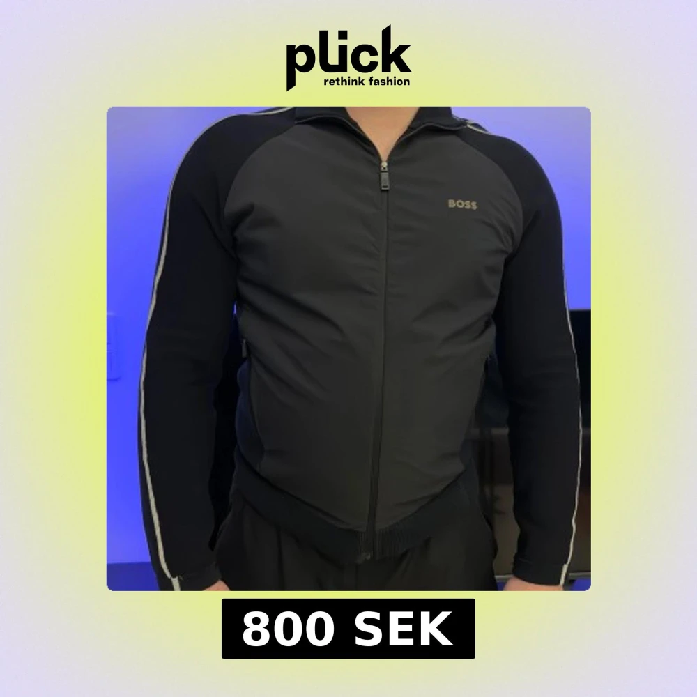 Svart ziptröja från BOSS med vita ränder längs ärmarna och diskret logga på bröstet. Tröjan har lång ärm, hög krage och dragkedja hela vägen. Materialet är en mix av polyester och bomull, vilket ger en sportig och clean look.