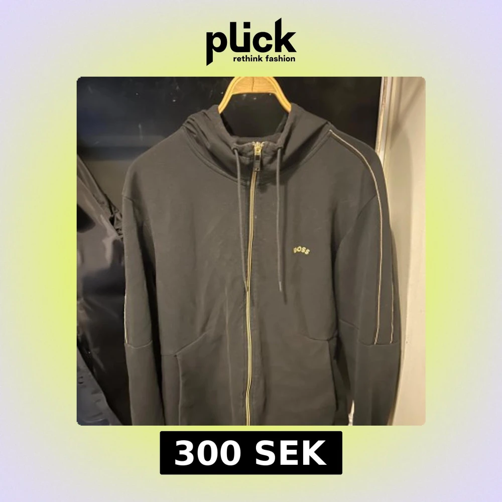 Säljer en stilren svart hoodie från Boss med dragkedja och huva. Tröjan har långa ärmar och dekorativa sömmar i kontrastfärg. Perfekt för en avslappnad stil.