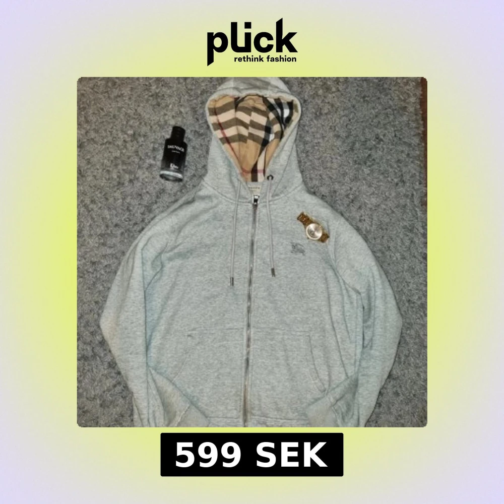 Säljer en grå hoodie från Burberry med dragkedja och det ikoniska rutiga fodret i huvan. Tröjan har broderad logga på bröstet och justerbar huva med snören. Perfekt för en stilren och bekväm look.den har bara lite problem med zipet