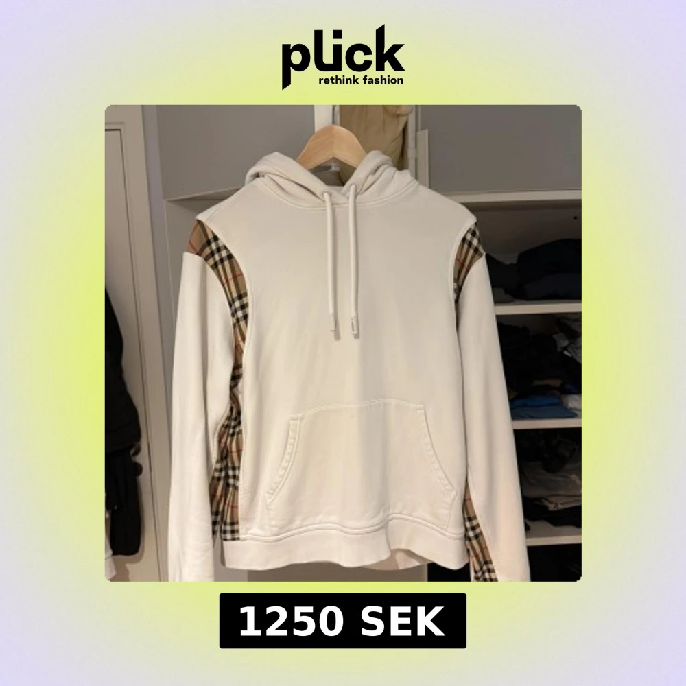Säljer en vit hoodie från Burberry i 100% bomull med klassiska rutiga paneler på axlar och sidor. Tröjan har huva med snörning, känguruficka och långa ärmar. Perfekt för dig som vill ha en stilren men ändå ikonisk look.