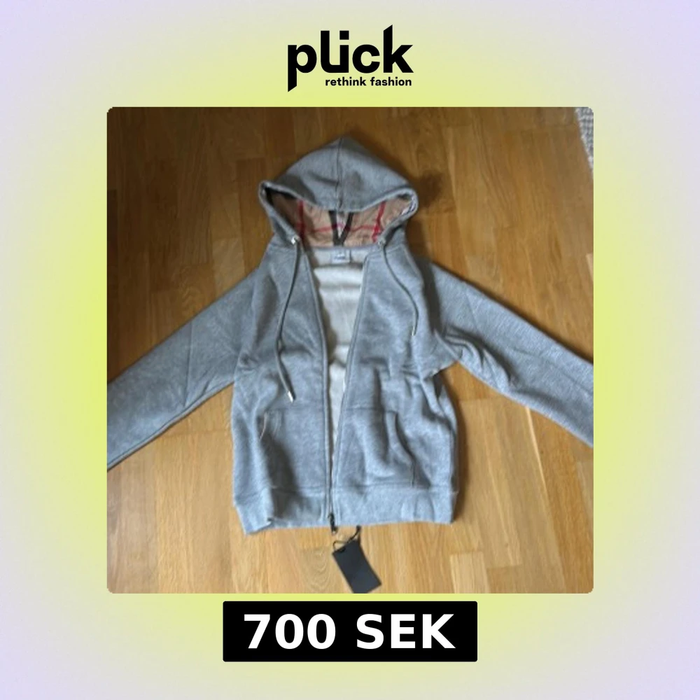 Snygg grå hoodie från Burberry med rutigt foder i huvan och broderad logga på bröstet. Tröjan har dragkedja, fickor och ribbade muddar. Perfekt för dig som gillar stilrena detaljer och vill ha något som sticker ut. Den är helt ny. Den passar som en storlek S men är L
