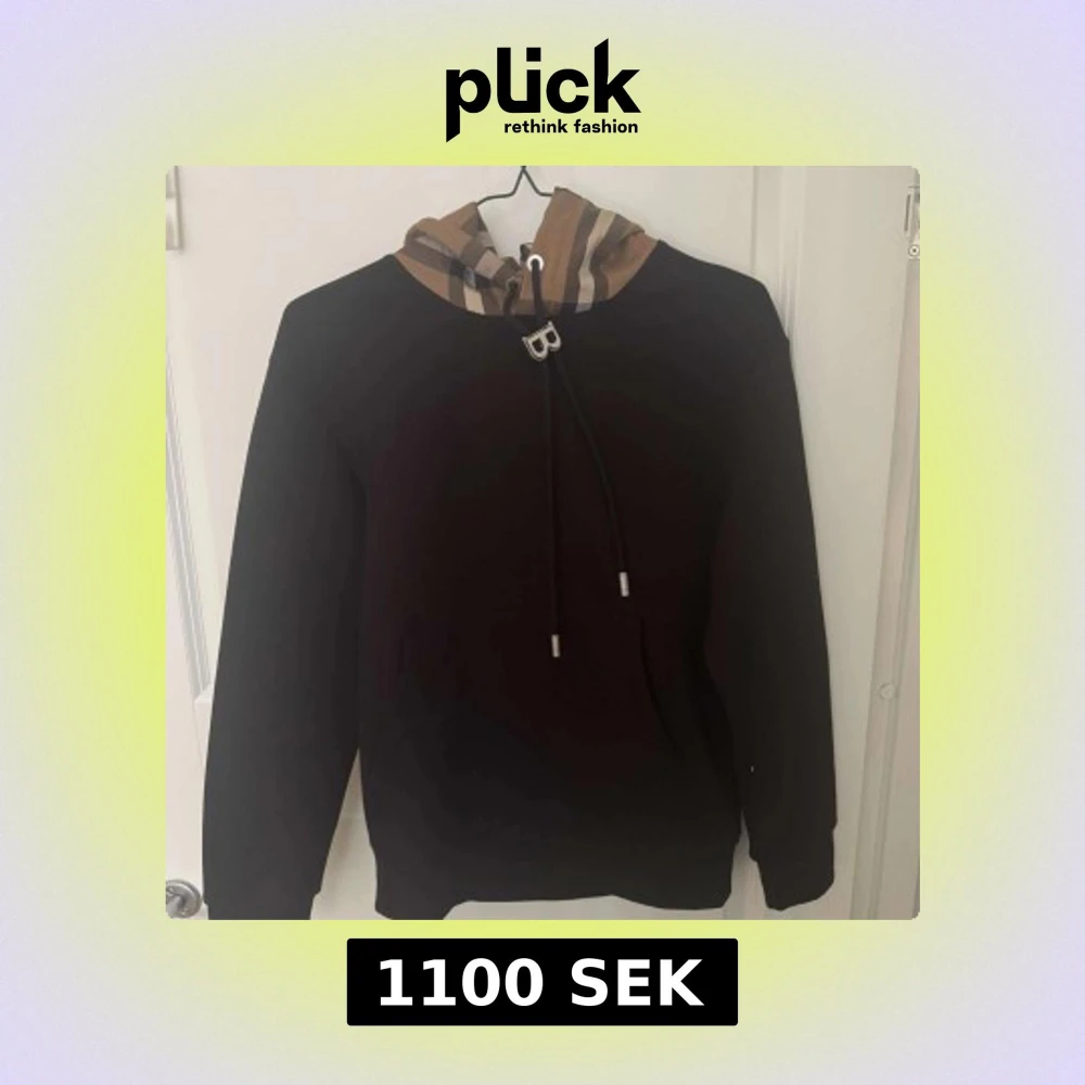 Svart hoodie från Burberry med klassisk rutig huva i beige, svart och vitt. Tröjan har långa ärmar, känguruficka och snörning med metalländar samt ett B-hänge. Perfekt för dig som gillar streetstyle och vill sticka ut med en ikonisk detalj.