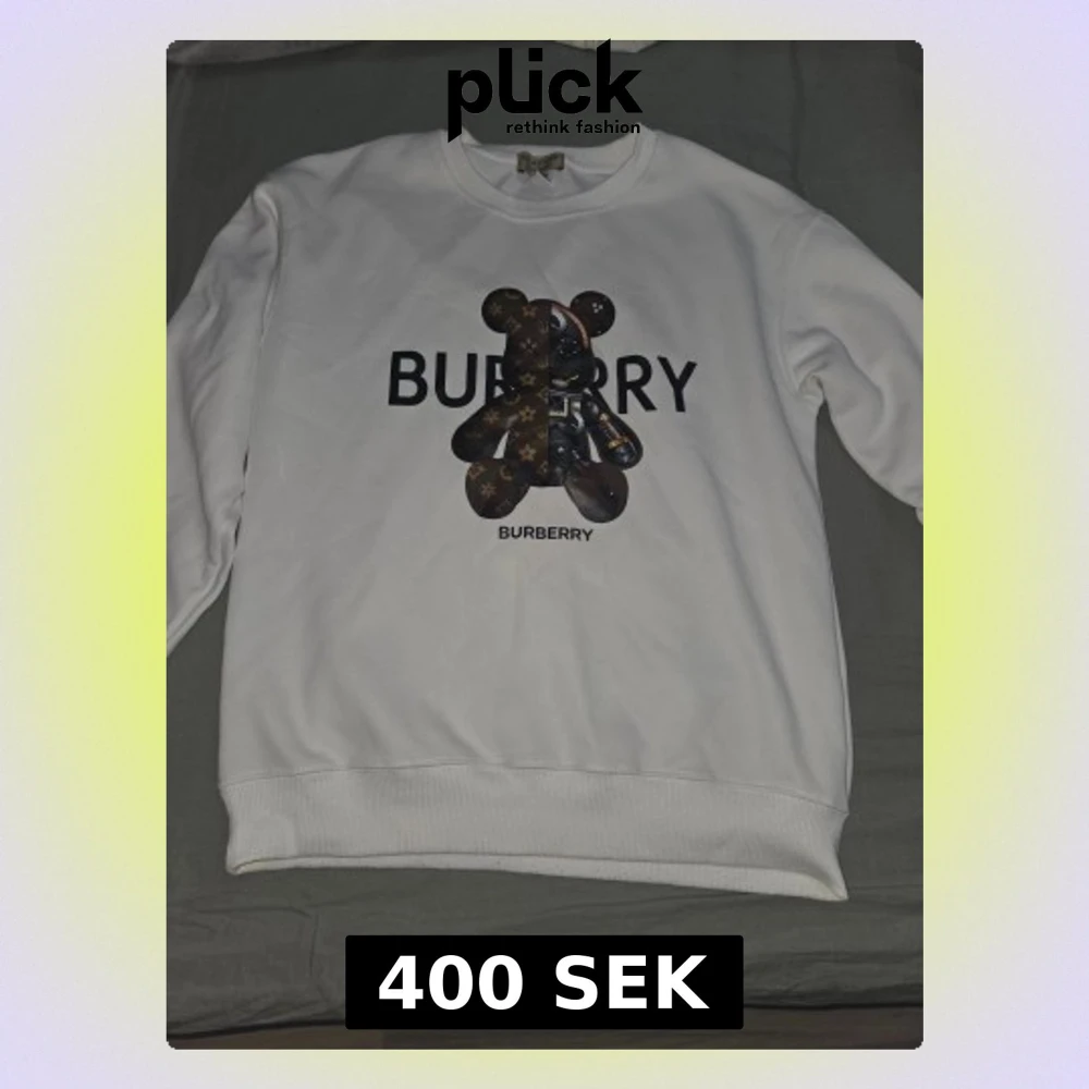 Vit sweatshirt från Burberry med ett stort tryck av en nalle på bröstet och tydlig Burberry-logga. Tröjan har rund hals, ribbade muddar och är långärmad. Materialet är mjuk bomull, perfekt för dig som gillar streetstyle och vill sticka ut. Storlek M men passar S