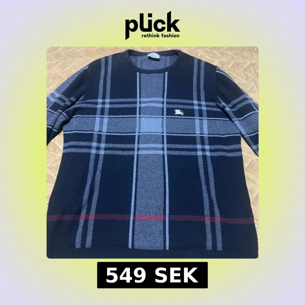 Säljer en Burberry-inspirerad tröja i riktigt fint skick. Tröjan är svart med klassiskt rutmönster i grått och vinrött, och har en broderad logga på bröstet. Skön att ha på sig och ser riktigt stilren ut – perfekt för dig som gillar designerstil till bättre pris.
