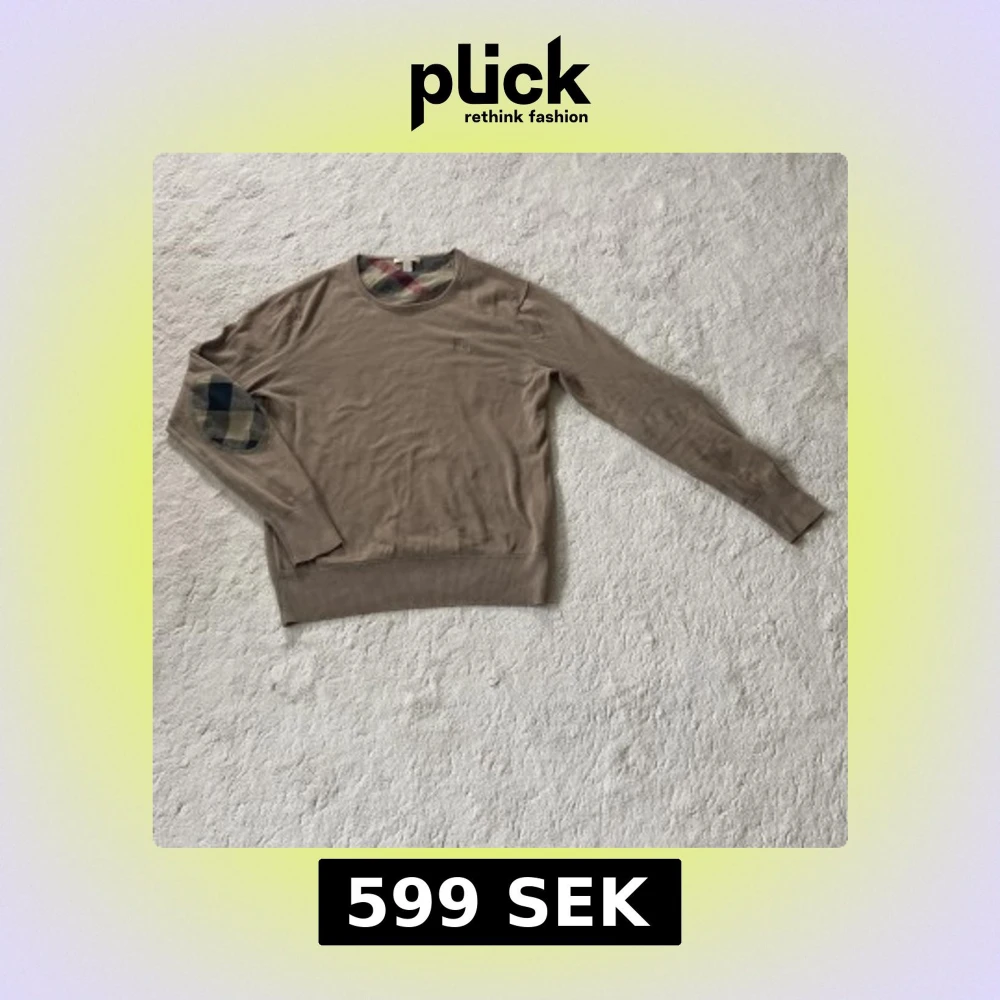 Säljer en beige långärmad tröja från Burberry med klassiska rutiga detaljer vid armbågarna och insidan av kragen. Tröjan har rund halsringning och broderad logga på bröstet. Perfekt för dig som gillar stilrena plagg med lyxig känsla.