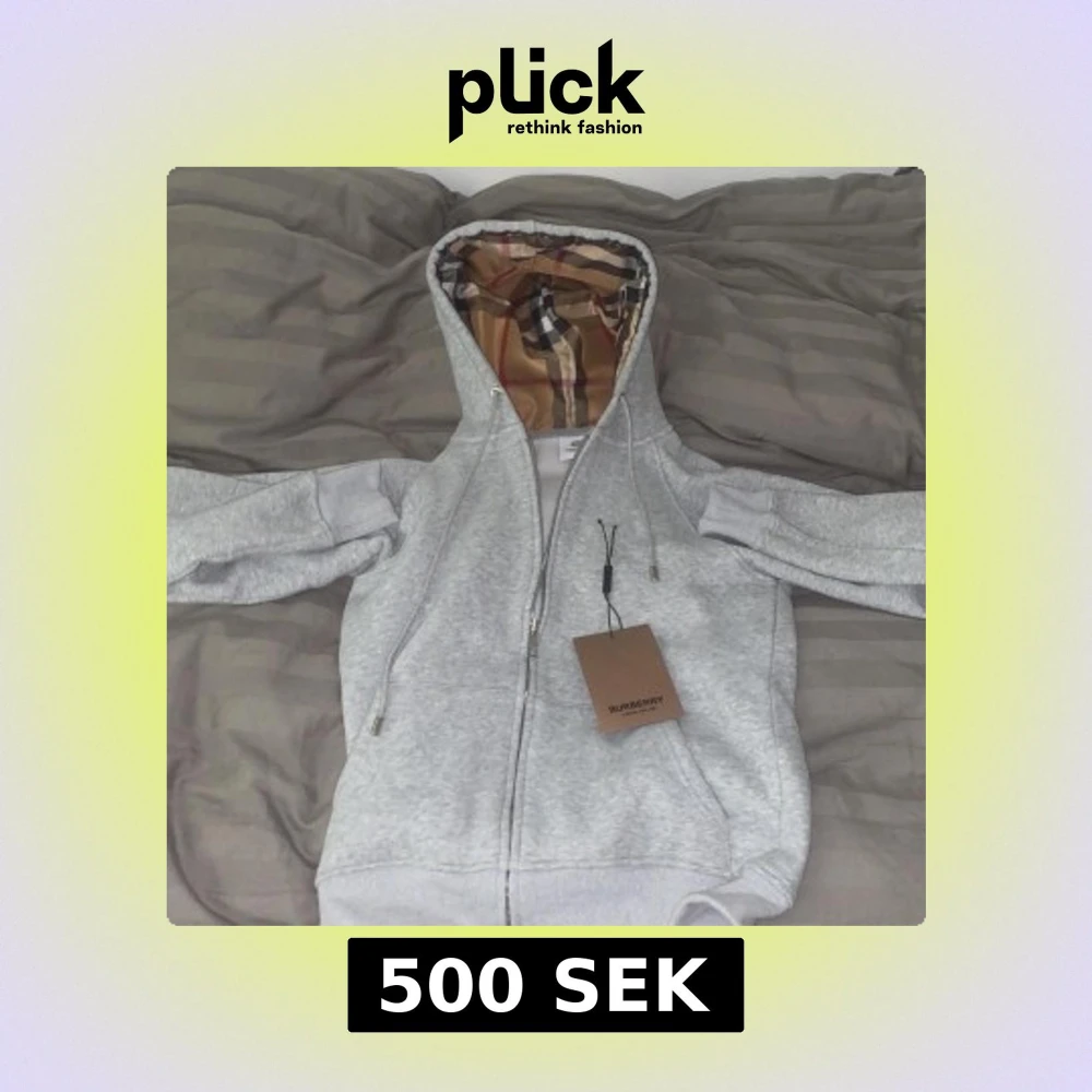 Burberry kofta - Säljer en stilren grå huvtröja från Burberry med dragkedja och klassiskt rutigt mönster i huvan. Tröjan har långa ärmar och en bekväm passform. Perfekt för en avslappnad look. Storlek M passar S