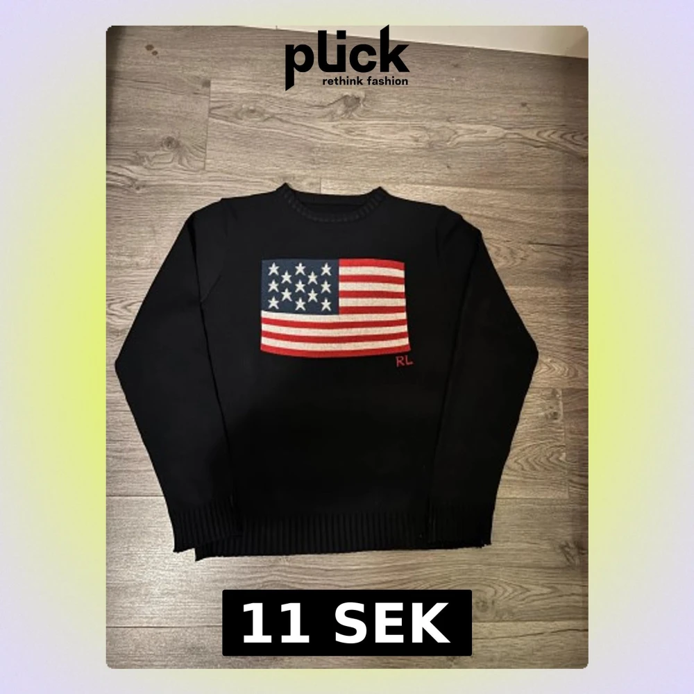Svart stickad tröja från Ralph Lauren med stor amerikansk flagga i rött, vitt och blått på bröstet. RL-broderi i rött under flaggan. Tröjan har rund hals och ribbade muddar vid ärmslut och nederkant. Perfekt för dig som gillar klassisk och cool stil.