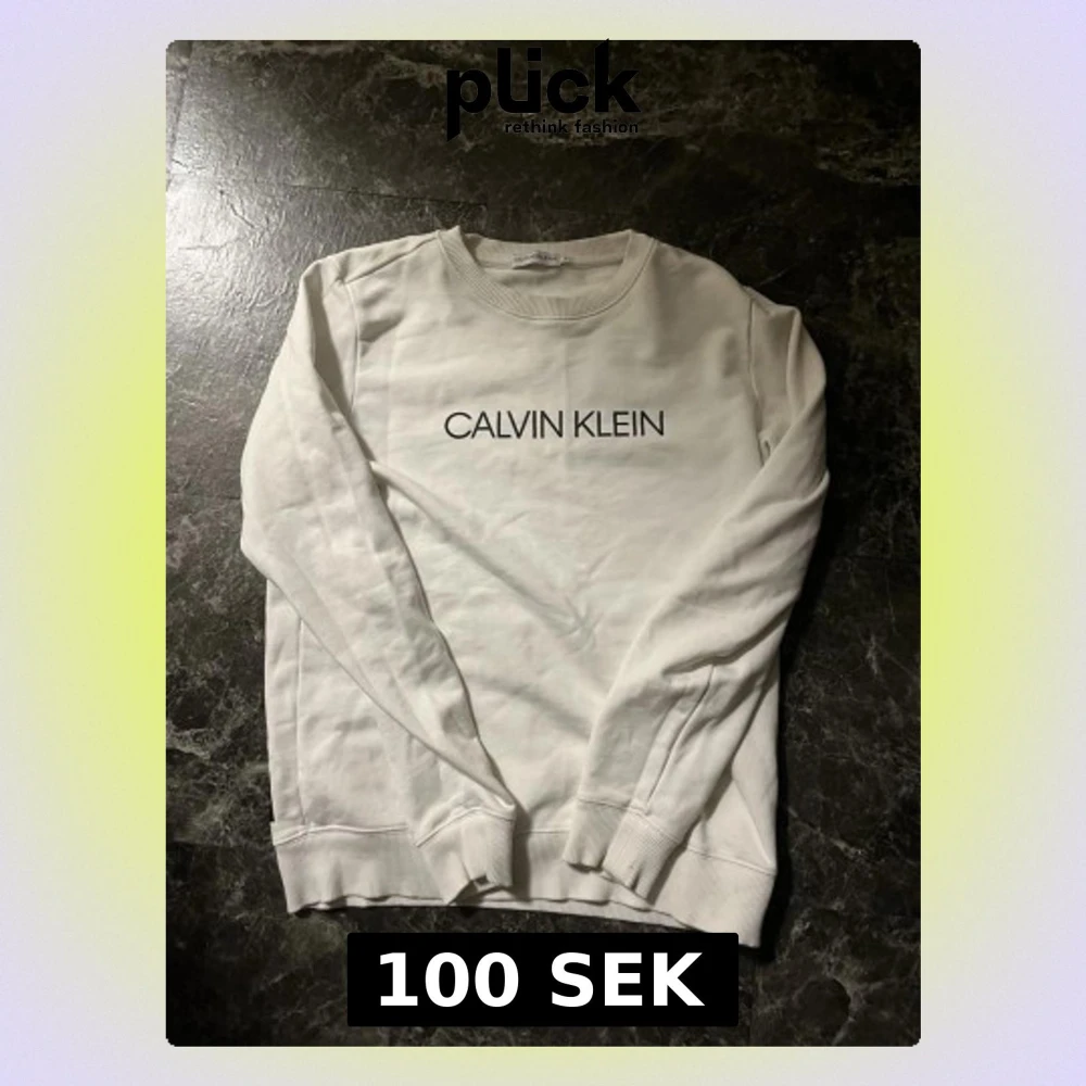 Säljer en clean vit sweatshirt från Calvin Klein med svart logga tryckt framtill. Tröjan har rund halsringning, långa ärmar och ribbade muddar vid ärmslut och nederkant. Perfekt för dig som gillar enkel och stilren design.
