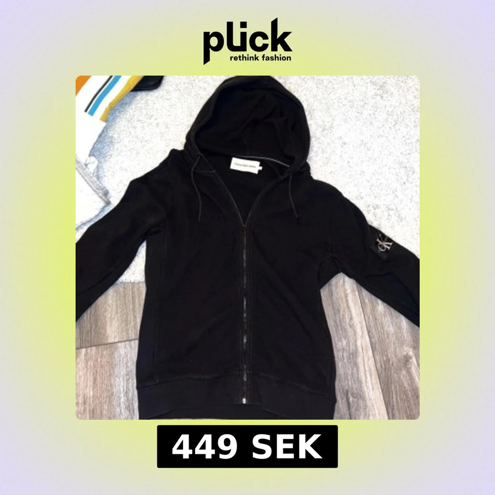 Svart kofta med dragkedja från Calvin Klein Jeans. Tröjan har huva med dragsko och en diskret logga på ärmen. Ordinarie pris ca 1000 kronor. Den är stor för mig, därav använd väldigt få gånger och perfekt skick.