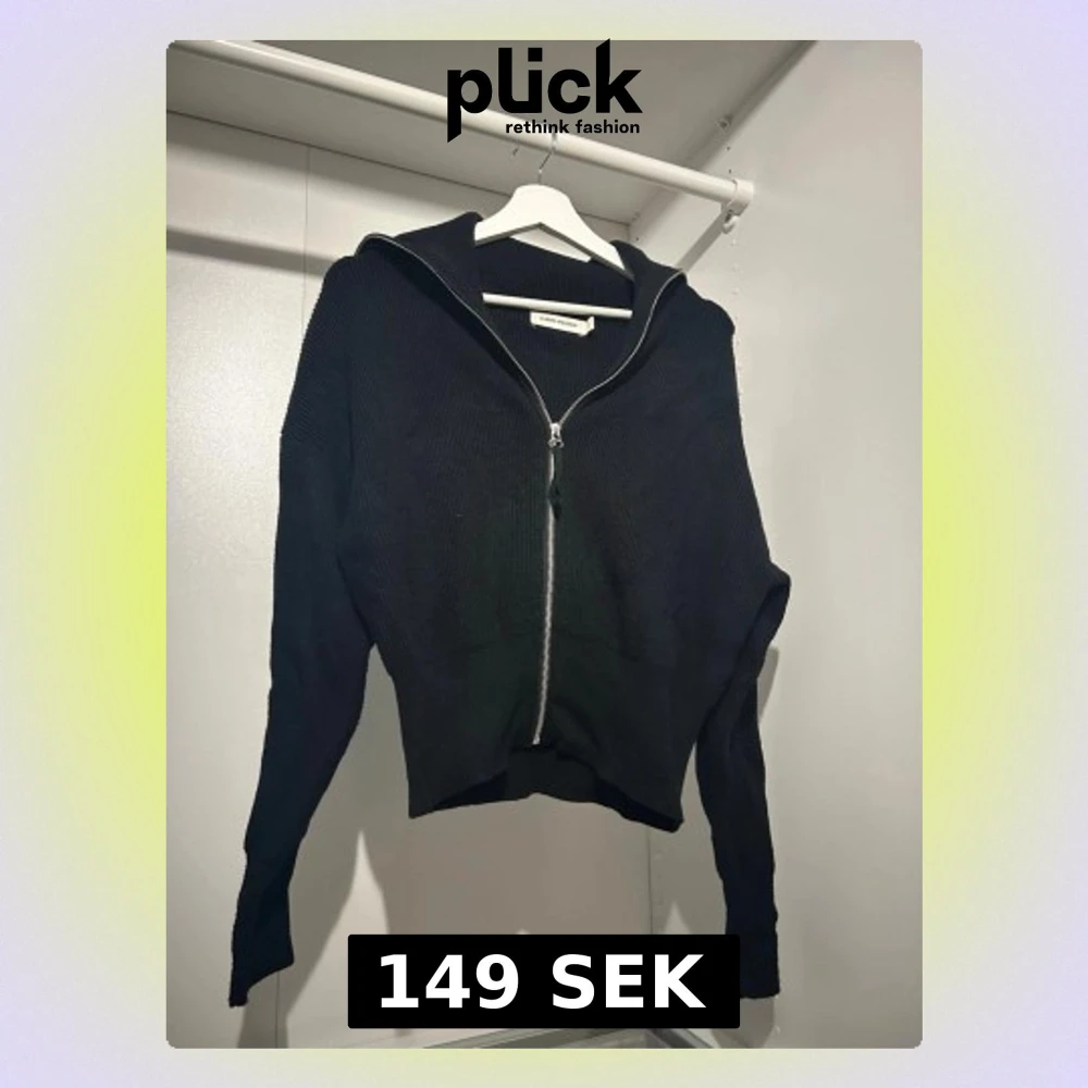 Svart stickad kofta från Carin Wester med lång ärm och silverfärgad dragkedja framtill. Koftan har en bred krage som kan bäras uppvikt eller nedvikt och är i en loose passform. Perfekt för lager-på-lager under kyliga dagar.